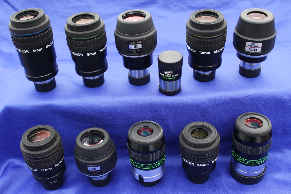 Die Qualität der Okulare sowie der Spiegel entscheidet über die Brauchbarkeit eines Fernrohrs an sich! Für den Anfang genügen 2 bis 3 Brennweiten vollauf, später können es ruhig ein paar mehr werden. Wichtige Kriterien für die Okularwahl – neben der Brennweite selbst – sind der Steckdurchmesser, das scheinbare Sehfeld, der Augenabstand, die Güte der Abbildung, Kontrast, Transparenz, Randschärfe und die Verarbeitung samt Haptik. Gerade bei schnellen Newton-Systemen wie bei meinem wird es bei Weitwinkelokularen mit einer ordentlichen Abbildung im Randbereich schnell eng. Wer die einschlägigen Preislisten kennt, der weiß, Okulare gibt es im Bereich von 20 bis weit über 600 Euro pro Stück.