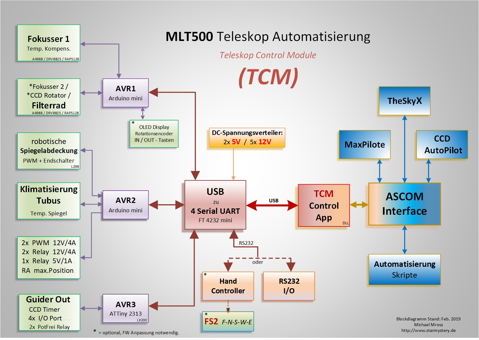 Das hier vorgestellte Telescope-Control-Modul (TCM) ermöglicht die Remotesteuerung sowie die autonome Steuerung eines beliebigen Teleskop und Astrographen. Im Einsatz für den CCD Astro-Fotografen oder auch für den anspruchsvollen visuellen Beobachter dient es zusätzlich als hilfreiches Kontroll- und Steuerinstrument für automatisierte Abläufe. Mit einem Windows basierten PC verbunden, werden alle Hauptfunktionen am Teleskop gesteuert und überwacht. Mit dem API „Application Programming Interface“ besteht die Möglichkeit alle vom TCM unterstützten Funktionen auch in die eigenen Anwendungen zu integrieren. Zusätzlich können alle Funktionen am Teleskop unabhängig vom steuer-PC autonom mit einem optionalen Hand-Controller bedient und wichtige Parameter abgelesen werden.